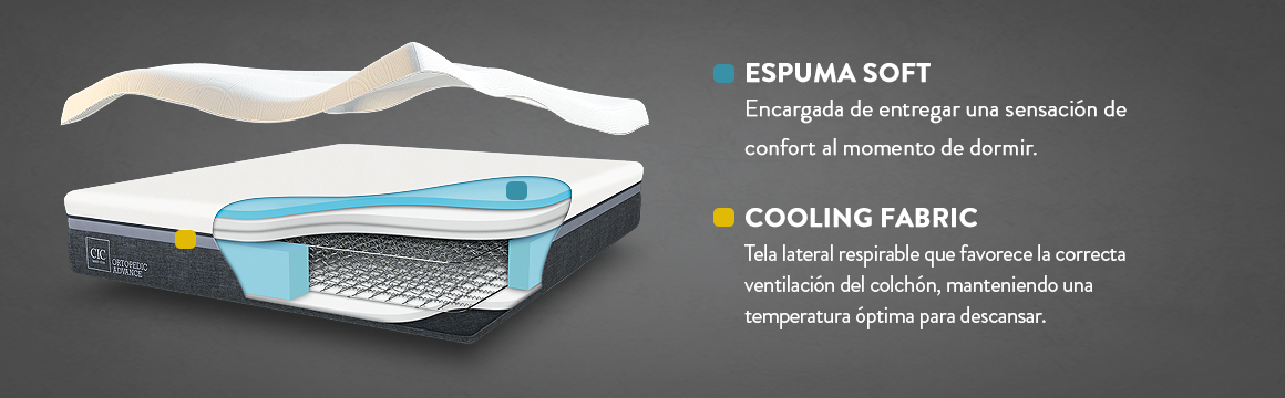 • Cooling Fabrics: Tela lateral respirable que favorece la correcta ventilación del colchón, manteniendo una temperatura óptima para descansar.